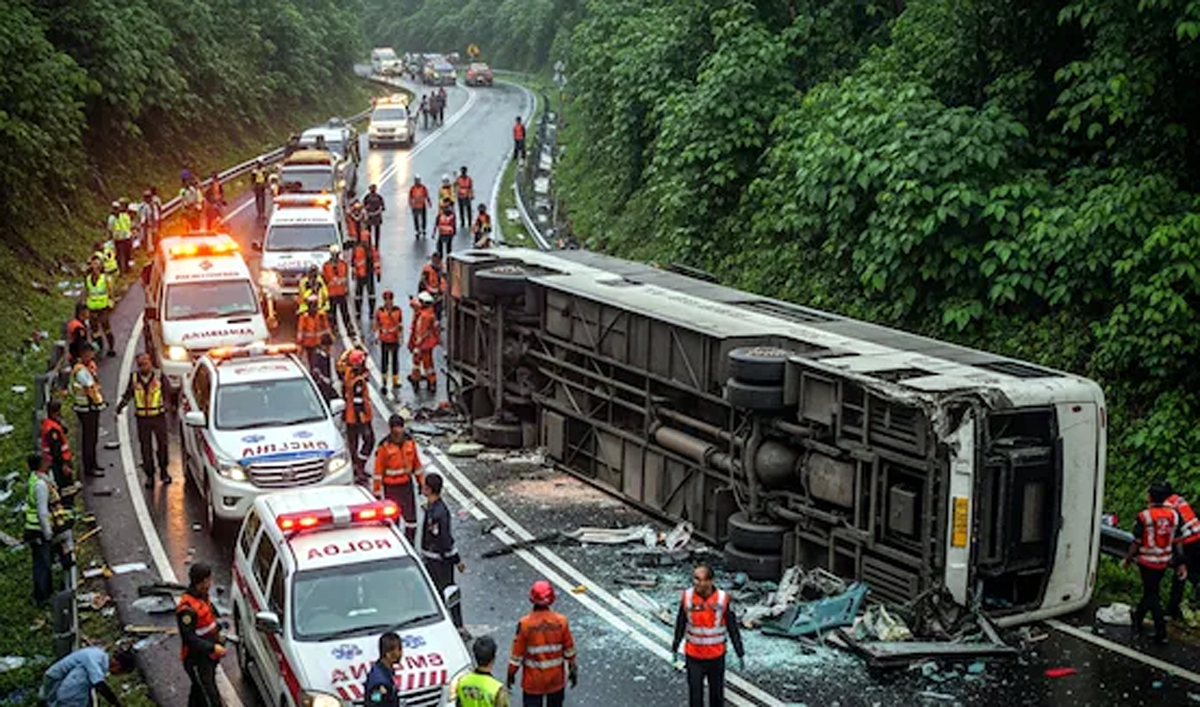 इंडोनेशिया में एक भीषण सड़क हादसे ने सोमवार रात कई परिवारों को शोक में डुबो दिया। राजधानी जकार्ता से ऐतिहासिक शहर योग्यकार्ता जा रही एक यात्री बस अनियंत्रित होकर कंक्रीट बैरियर से टकरा गई और पलट गई। इस हादसे में कम से कम 16 लोगों की जान चली गई, जबकि कई अन्य यात्री गंभीर रूप से घायल हो गए। स्थानीय प्रशासन के अनुसार, बस में कुल 34 यात्री सवार थे। दुर्घटना आधी रात के आसपास हुई, जब तेज रफ्तार के दौरान ड्राइवर बस पर से नियंत्रण खो बैठा। टक्कर इतनी जबरदस्त थी कि कई यात्री बस से बाहर जा गिरे, जबकि कुछ लोग क्षतिग्रस्त बस के ढांचे में फंस गए।