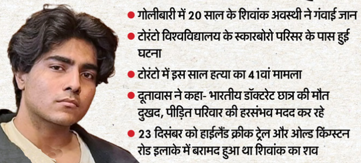 कनाडा के टोरंटो में हुई एक सनसनीखेज गोलीबारी की घटना में भारत के एक युवा छात्र की जान चली गई। मृतक की पहचान 20 वर्षीय भारतीय छात्र शिवांक अवस्थी के रूप में हुई है, जो टोरंटो विश्वविद्यालय के स्कारबोरो परिसर में पढ़ाई कर रहा था।
