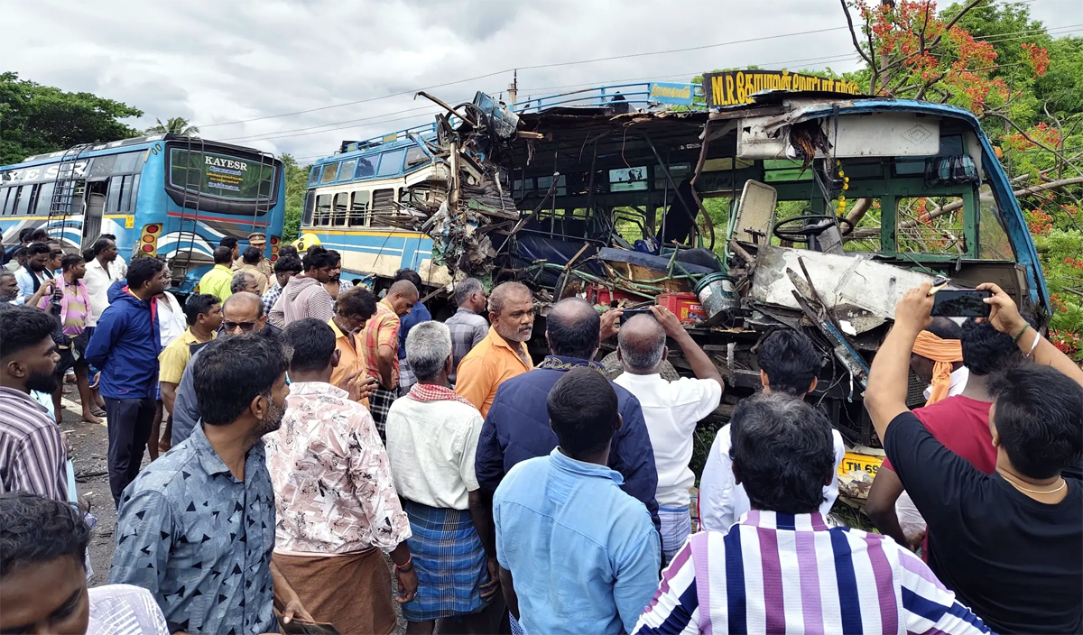 तमिलनाडु के तेनकासी जिले से एक दर्दनाक सड़क हादसे की खबर सामने आई है। जानकारी के अनुसार, इडाइकल के पास कामराजपुरम क्षेत्र में दो निजी बसों की जोरदार भिड़ंत हो गई। इस हादसे में अब तक 6 लोगों के मौत की पुष्टि हुई है, जबकि 30 से अधिक यात्री घायल बताए जा रहे हैं। हादसे को लेकर विस्तृत जानकारी जुटाई जा रही है।