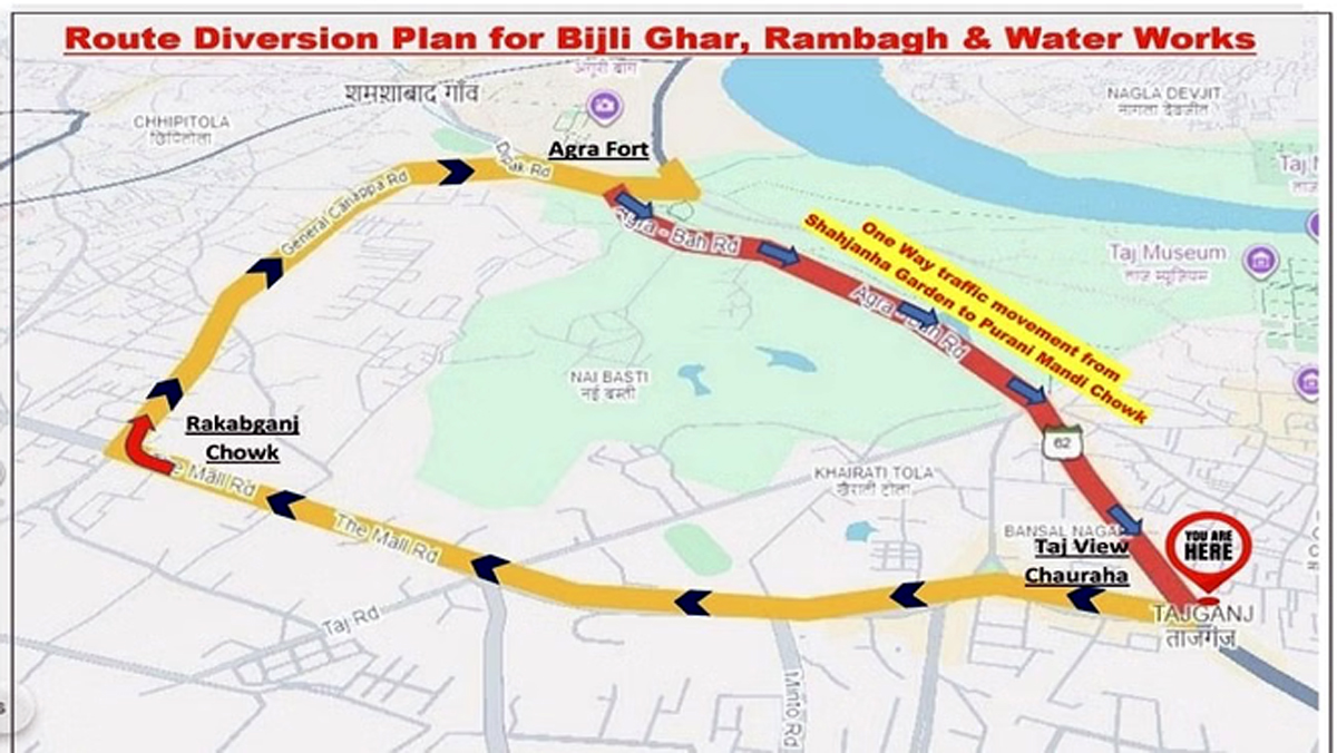ट्रैफिक पुलिस ने वैकल्पिक मार्ग के रूप में पुरानी मंडी से सर्किट हाउस रोड होते हुए माल रोड और टक्कर रोड तय किया है। जल निगम ग्रामीण द्वारा 1400 मिमी व्यास की राइजिंग मेन लाइन बिछाने का कार्य इस क्षेत्र में किया जा रहा है, जिसके चलते यह बदलाव किया गया है। हालांकि आगरा किले की दिशा से आने वाले वाहन शाहजहां पार्क होते हुए पुरानी मंडी चौराहे तक पहुंच सकेंगे, लेकिन वापसी के लिए उन्हें लंबा रास्ता अपनाना होगा। ताजगंज, फतेहाबाद रोड, ताजनगरी, राजपुर चुंगी और शमशाबाद रोड से शहर या हाईवे की ओर जाने वाले वाहन चालकों को भी अतिरिक्त दूरी तय करनी पड़ेगी। प्रशासन ने लोगों से अपील की है कि यात्रा से पहले वैकल्पिक मार्गों की जानकारी लेकर ही निकलें, ताकि असुविधा से बचा जा सके।