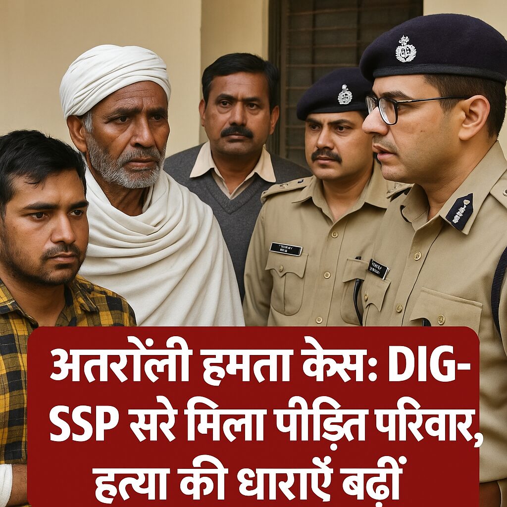 अतराैली में बरातियों पर हुए हमले और दूल्हे के चचेरे भाई विनय की मौत के मामले में न्याय की मांग को लेकर पीड़ित परिवार मंगलवार को डीआईजी रेंज प्रभाकर चौधरी और एसएसपी नीरज कुमार जादौन से मिला। अधिकारियों ने परिवार को निष्पक्ष जांच का भरोसा दिया और बताया कि केस में अब हत्या व हत्या के प्रयास की धाराएं जोड़ दी गई हैं। यह सुनकर परिजन लौट गए, लेकिन उन्होंने फरार आरोपियों की शीघ्र गिरफ्तारी की मांग दोहराई।