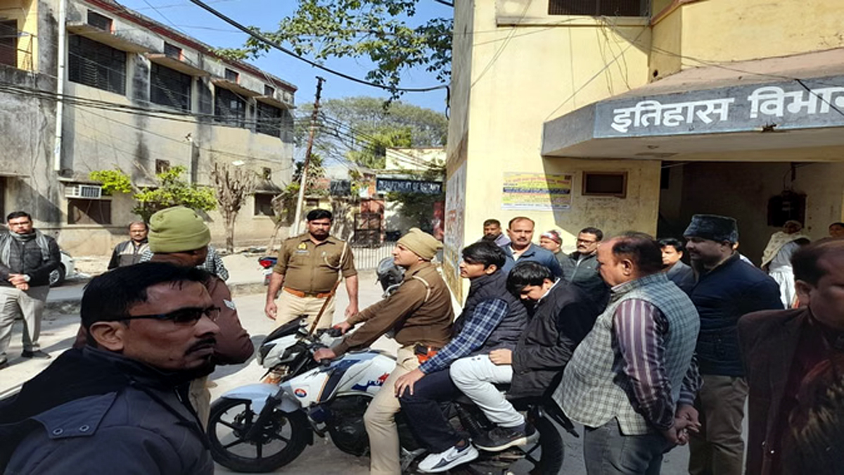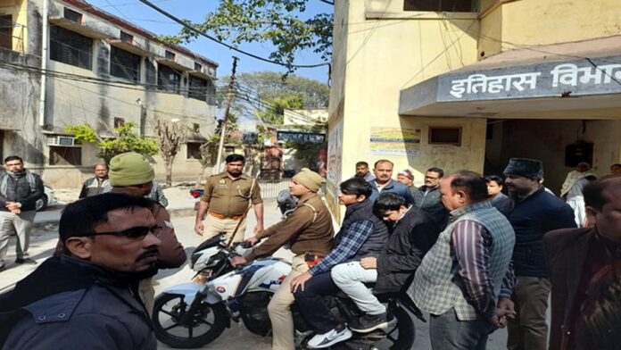 एलएलबी की परीक्षा सुबह 11:30 बजे शुरू हुई थी। करीब 15 मिनट बाद दो युवक परीक्षा भवन में प्रवेश करने का प्रयास करते पाए गए। पूछताछ के दौरान दोनों का व्यवहार उग्र हो गया। सूचना मिलने पर जब चीफ प्रॉक्टर मौके पर पहुंचे तो कहासुनी और तेज हो गई। इसी दौरान चीफ प्रॉक्टर द्वारा एक छात्र को थप्पड़ मारने का आरोप है, जिसके बाद दोनों युवकों ने उनके साथ धक्का-मुक्की शुरू कर दी। घटना की जानकारी मिलते ही अन्य शिक्षक भी वहां पहुंच गए। अफरा-तफरी के बीच एक युवक मौके से भाग निकला, जबकि दूसरे को पकड़ लिया गया। तलाशी लेने पर पकड़े गए युवक के पास से एलएलबी प्रथम सेमेस्टर के गेस पेपर बरामद हुए। कुछ देर बाद दूसरे युवक को भी हिरासत में ले लिया गया।