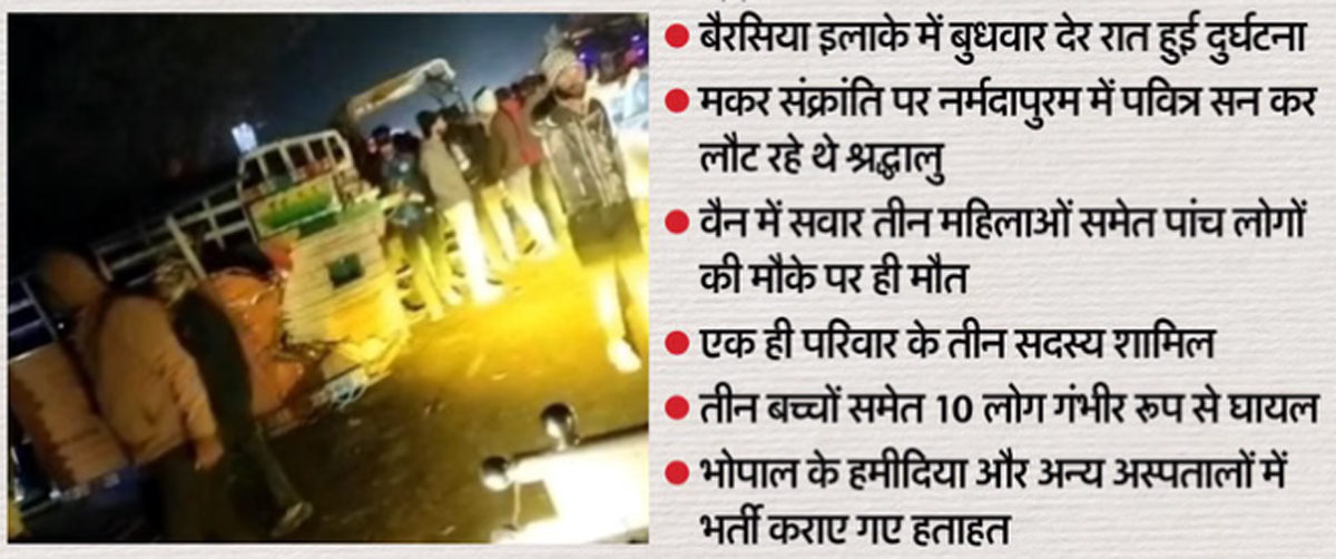 भोपाल के ग्रामीण क्षेत्र बैरसिया में मकर संक्रांति की रात एक दर्दनाक सड़क दुर्घटना ने पूरे इलाके को झकझोर कर रख दिया। पिकअप (लोडिंग वाहन) और ट्रैक्टर-ट्रॉली की आमने-सामने टक्कर में एक ही परिवार के पांच सदस्यों की मौके पर ही मौत हो गई, जबकि 12 लोग घायल हो गए। घायलों में महिलाएं और बच्चे भी शामिल हैं, जिनका इलाज बैरसिया अस्पताल में जारी है।