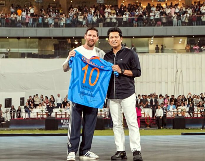 वानखेड़े में क्रिकेट और फुटबॉल का खूबसूरत मेल देखने को मिला, जब सचिन तेंदुलकर और लियोनल मेसी ने एक-दूसरे को खास तोहफे दिए। सचिन ने मेसी को अपनी साइन की हुई भारतीय टीम की 10 नंबर जर्सी भेंट की, जबकि मेसी ने उन्हें एक फुटबॉल गिफ्ट की।