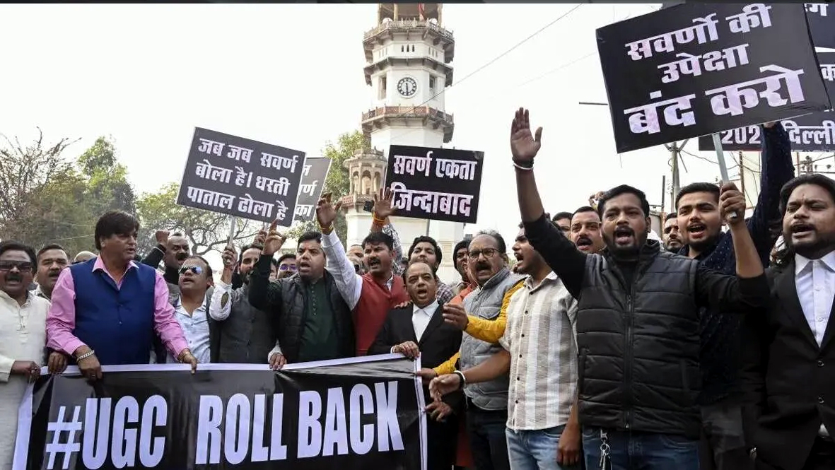 लखनऊ में UGC के नए नियमों को लेकर सवर्ण समाज के लोगों में भारी नाराजगी देखने को मिली। सवर्ण मोर्चा के बैनर तले बड़ी संख्या में लोगों ने सड़कों पर उतरकर विरोध प्रदर्शन किया और नियमों को तत्काल वापस लेने की मांग की। प्रदर्शनकारियों का कहना है कि नए नियम समाज के एक वर्ग के साथ अन्याय करते हैं और यह पूरी तरह भेदभावपूर्ण हैं। प्रदर्शन को देखते हुए प्रशासन पूरी तरह सतर्क नजर आया। परिवर्तन चौक से शुरू हुए इस आंदोलन के दौरान सुरक्षा के कड़े इंतजाम किए गए थे। मौके पर लखनऊ पुलिस के वरिष्ठ अधिकारी मौजूद रहे, वहीं RAF की टुकड़ियां भी तैनात की गई थीं ताकि किसी भी तरह की अव्यवस्था न हो। प्रदर्शन शांतिपूर्ण रहा, लेकिन सवर्ण समाज ने साफ शब्दों में कहा कि जब तक उनकी मांगें नहीं मानी जातीं, उनका आंदोलन जारी रहेगा।