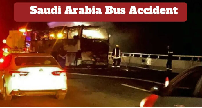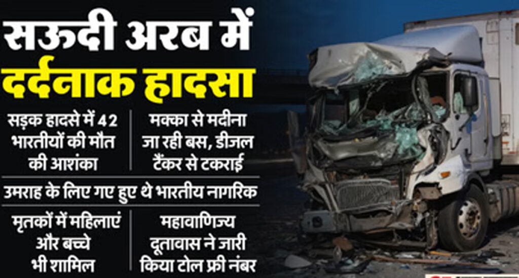 सऊदी अरब में सोमवार देर रात एक दर्दनाक सड़क दुर्घटना में 40 से अधिक भारतीय नागरिकों की मौत होने की संभावना जताई जा रही है। यह हादसा उस समय हुआ जब उमराह करने जा रहे श्रद्धालुओं को ले जा रही एक बस रास्ते में तेल भरे टैंकर से टकराकर आग की चपेट में आ गई। बताया जा रहा है कि अधिकांश यात्री भारत के थे और उनमें से बड़ी संख्या हैदराबाद से संबंधित बताई जा रही है।