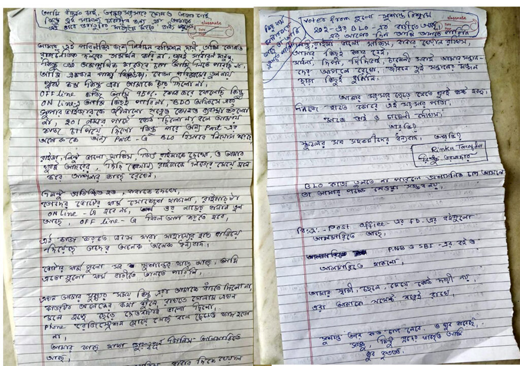 पश्चिम बंगाल में चल रहे स्पेशल इंटेंसिव रिवीजन (SIR) अभियान के बीच कृष्णानगर से एक दर्दनाक घटना सामने आई है। यहाँ एक महिला बूथ लेवल ऑफिसर (BLO) रिंकू तरफदार ने कथित तौर पर अपनी जान दे दी। पुलिस को घटनास्थल से एक नोट मिला है, जिसमें उन्होंने SIR से जुड़े काम के भारी दबाव का जिक्र किया है। रिंकू तरफदार कृष्णानगर के षष्ठी तलाई क्षेत्र में रहती थीं और चापरा थाने के बंगालझी इलाके के बूथ नंबर 202 पर BLO के रूप में कार्यरत थीं। मिले हुए नोट में उन्होंने लिखा है कि BLO के काम में चूक होने पर “एडमिनिस्ट्रेटिव प्रेशर” बढ़ जाने की बात उन्हें स्वीकार नहीं थी और इसी तनाव ने उन्हें तोड़ दिया।